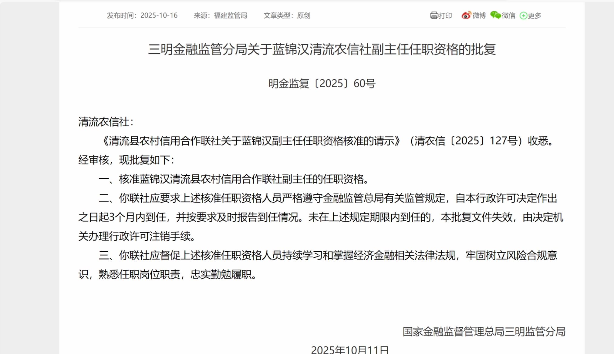 10月16日,三明金融监管分局发布关于蓝锦汉清流农信社副主任任职资格的批复,核准蓝锦汉清流县农村信用合作联社副主任的任职资格。